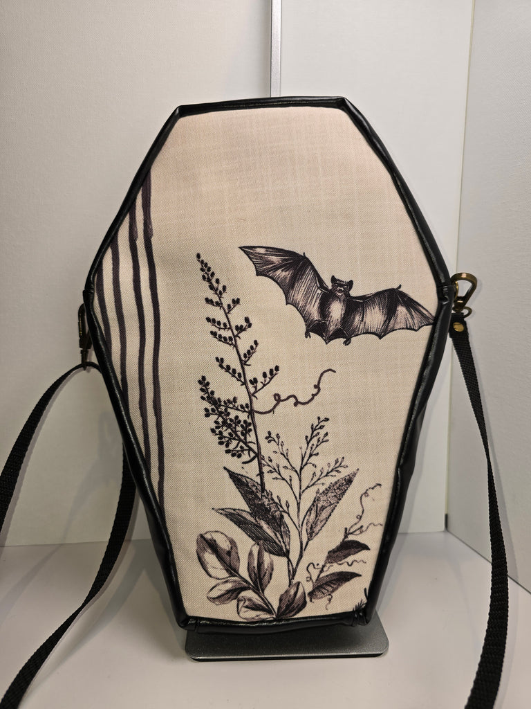 This Purse has bats on either side. Different patterns on each panel but all bats and florals