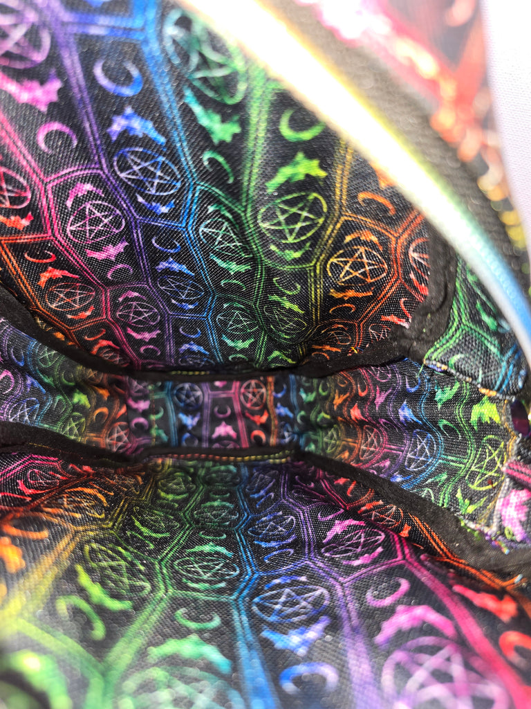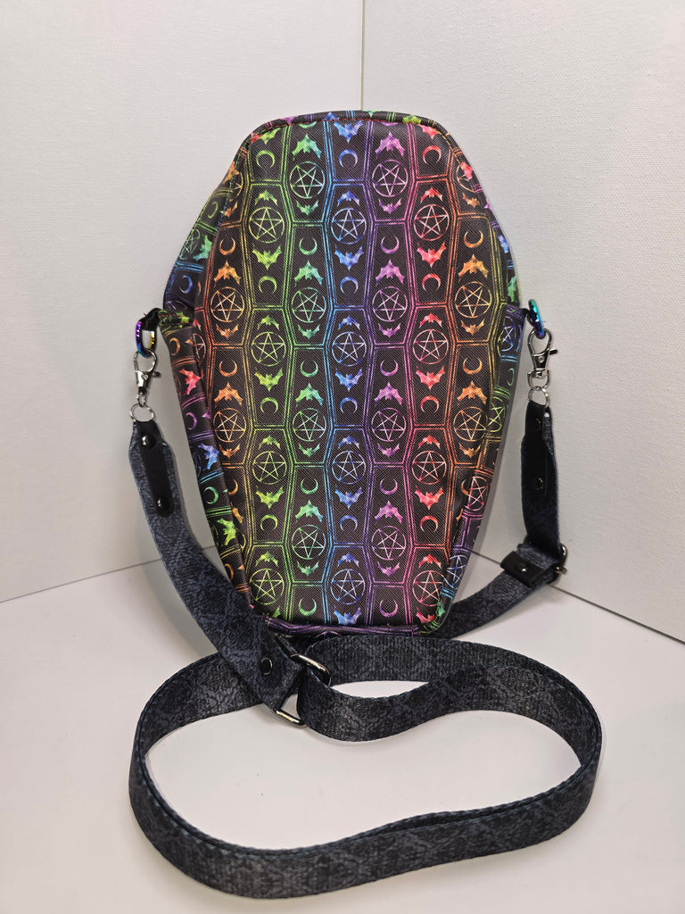 This coffin purse is made of vinyl (exterior) and canvas (interior)