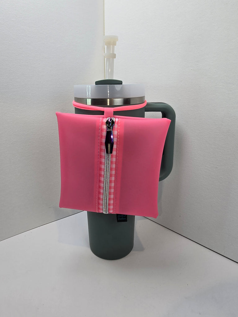 Elastic wraps around the cup and keeps the pouch in place. The elastic will expand to any size cup you have - for refernece the cup pictured is a 40 oz.